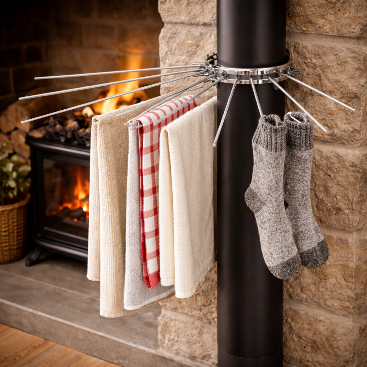 Optimisez le fonctionnement de votre poêle avec ce séchoir pour tuyau, vous disposerez de 8 fils résistant pour étendre votre linge, tissus, autour du tuyau.