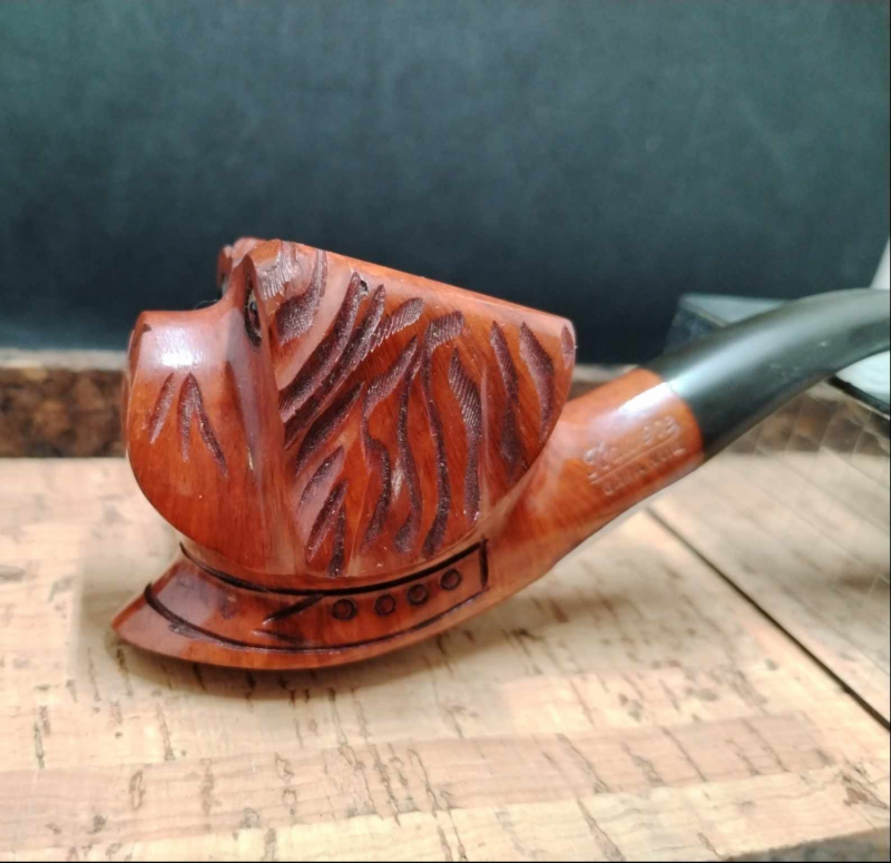 La véritable pipe de Saint Claude ! Un modèle original avec son fourneau sculpté en tête de chien en bois de bruyère.